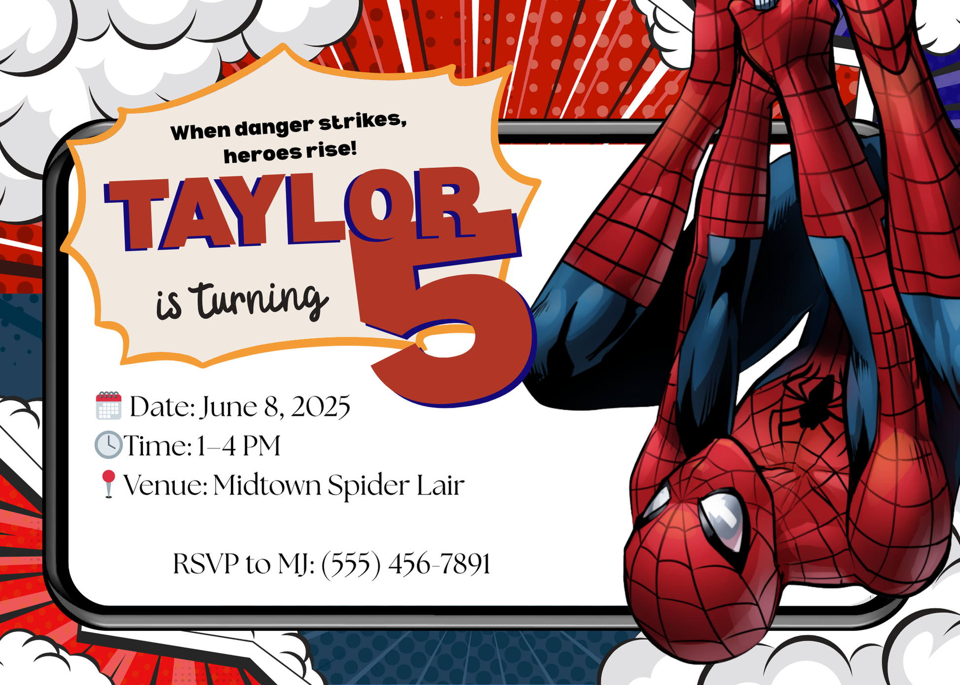 Swing into action with our Spiderman-Inspired Birthday Invitation! Perfect for little heroes who love web-slinging fun, red-and-blue adventures, and superhero excitement, this invitation brings comic-style energy to your child’s big day.